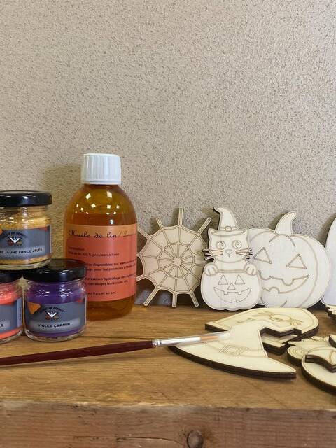 En ce mois d’octobre, découvrez ce nouveau kit de peinture sur bois pour enfants sur le thème d’Halloween. 100% made in France, il contient 10 créations en bois (peuplier) fabriquées artisanalement et localement par Nine Créations, 5 pigments Ocres de France (ocre jaune foncé JFLES, ocre rouge RFLES, orange rupicola, violet carmin et noir Indien), ainsi que 250ml d’huile de lin.