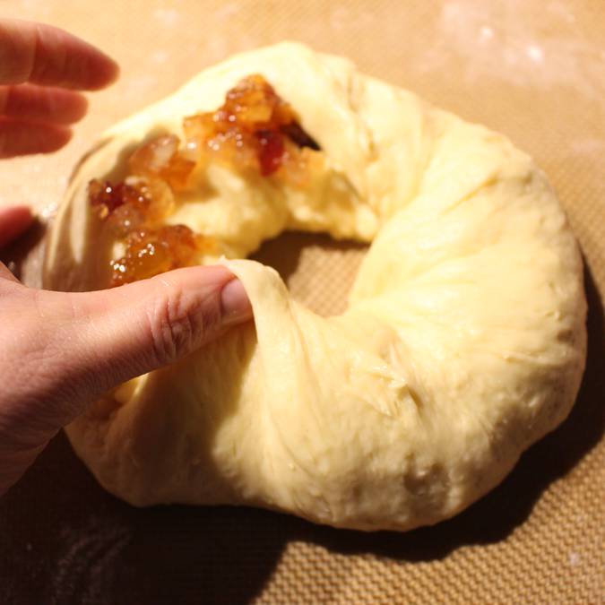 Comme toute recette, il y a une technique ! Après avoir travaillé la pâte, faire une belle boule bien ronde et réaliser un trou en son milieu, assez large et étirer la pâte sans la casser : former la couronne.