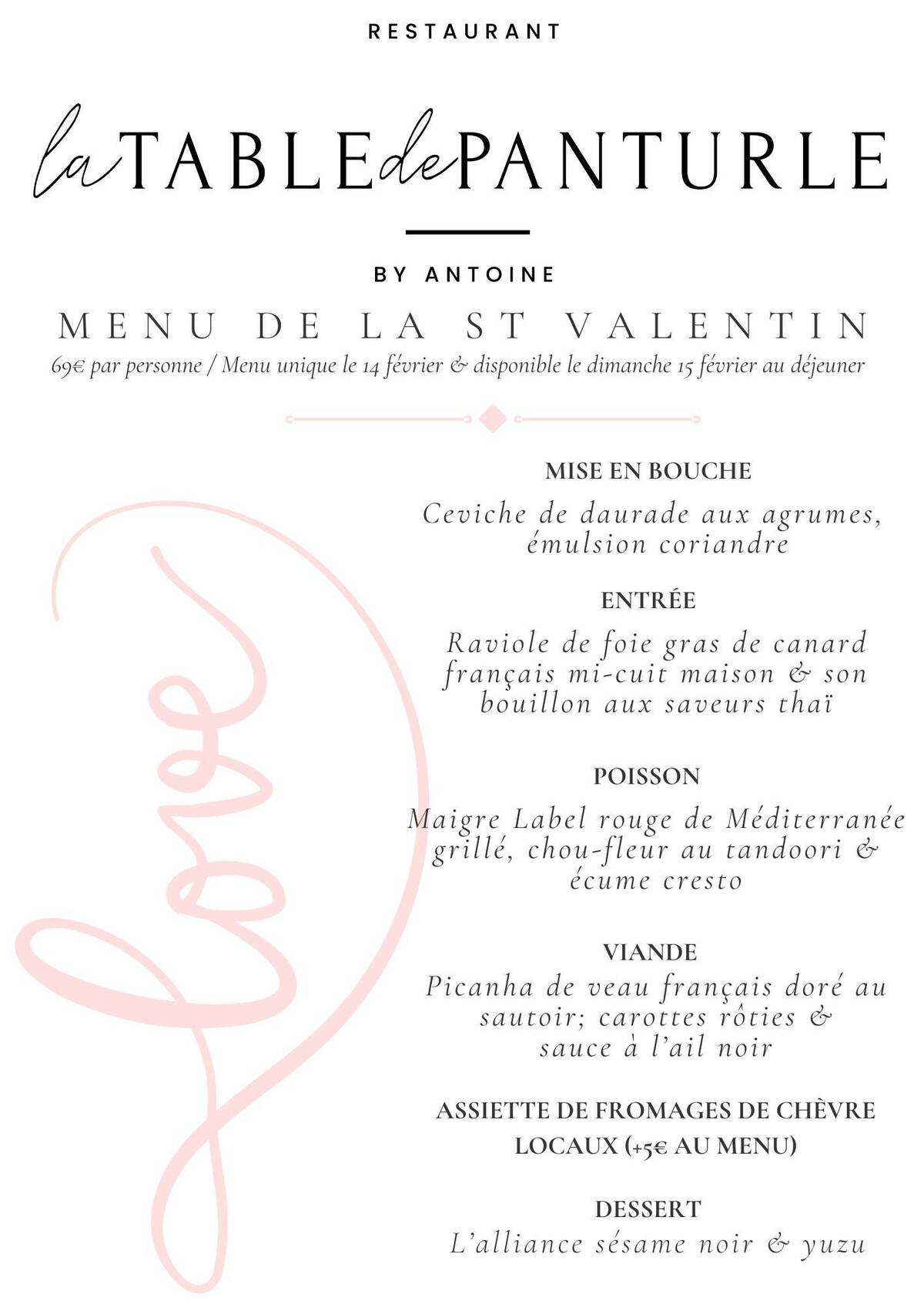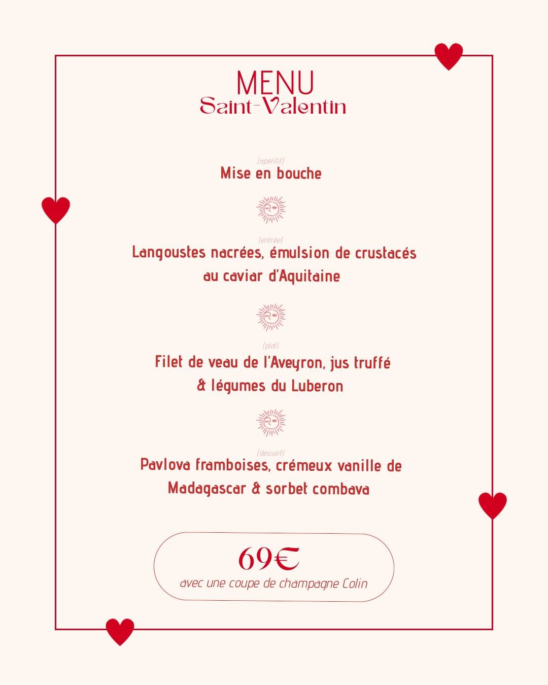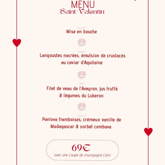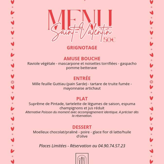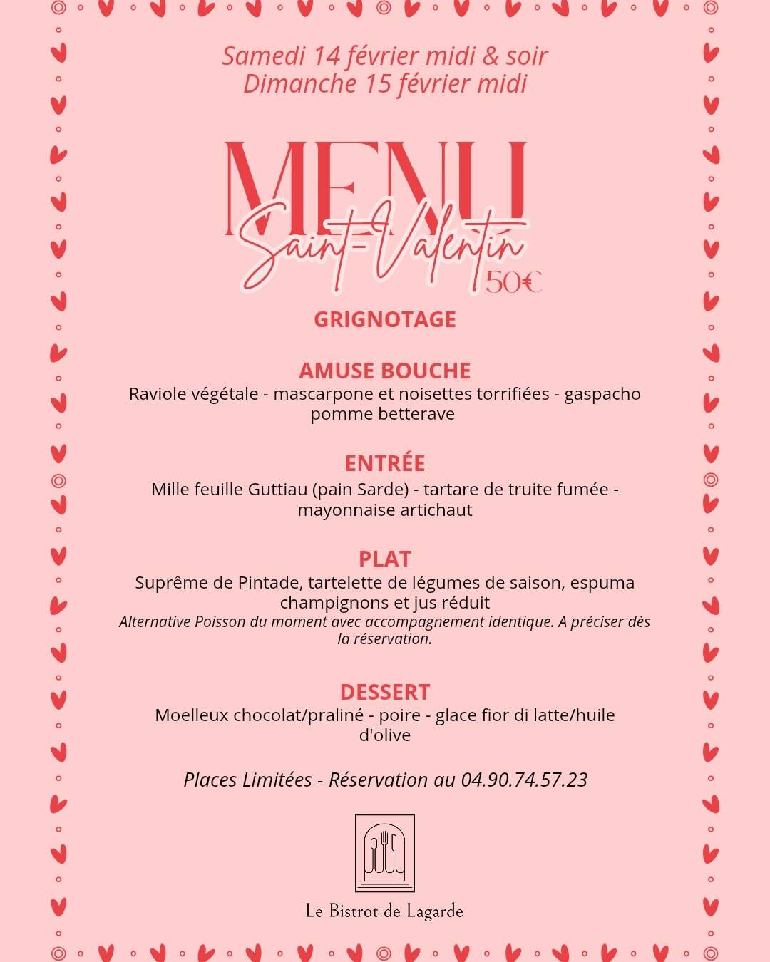 Menu St Valentin 50€/pers - Réservation avant le 11 février par téléphone ou lebistrotdelagarde@gmail.com